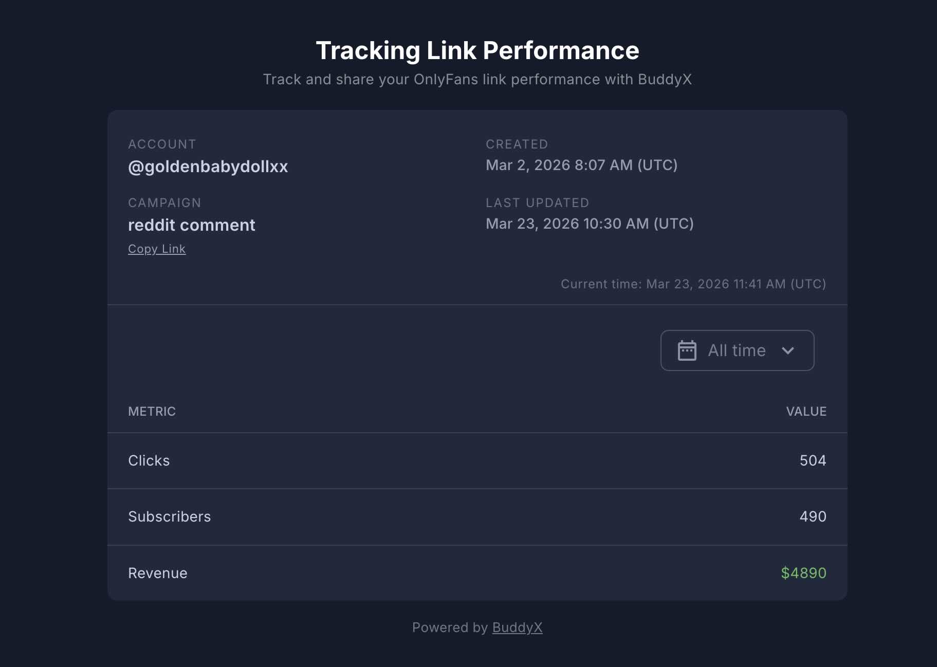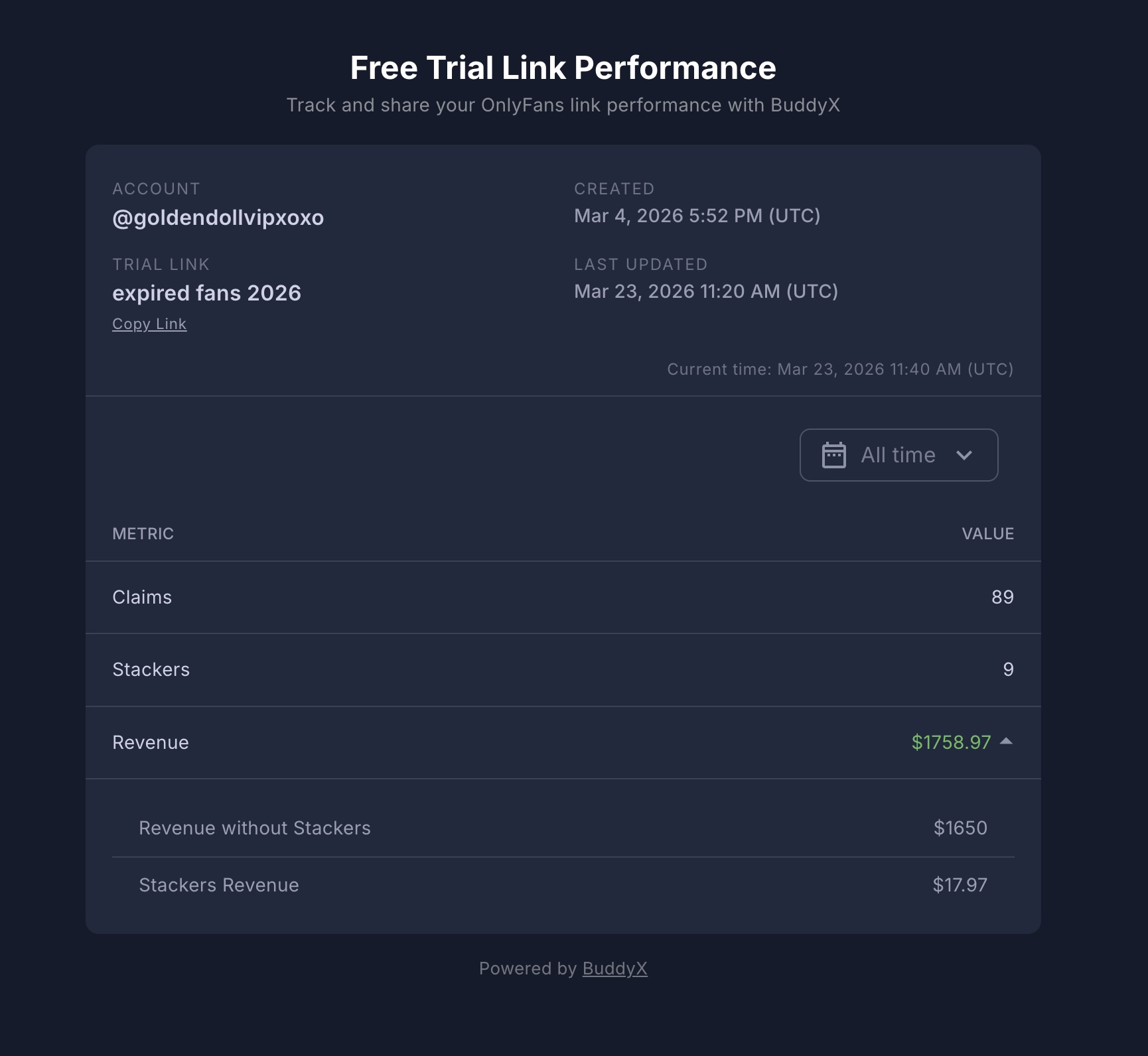 BuddyX ahora te permite crear enlaces compartibles para tus Enlaces de Prueba Gratuita (FTL) y Enlaces de Seguimiento (TL), para que puedas compartir datos de rendimiento en tiempo real con quien quieras, sin necesidad de una cuenta de BuddyX.