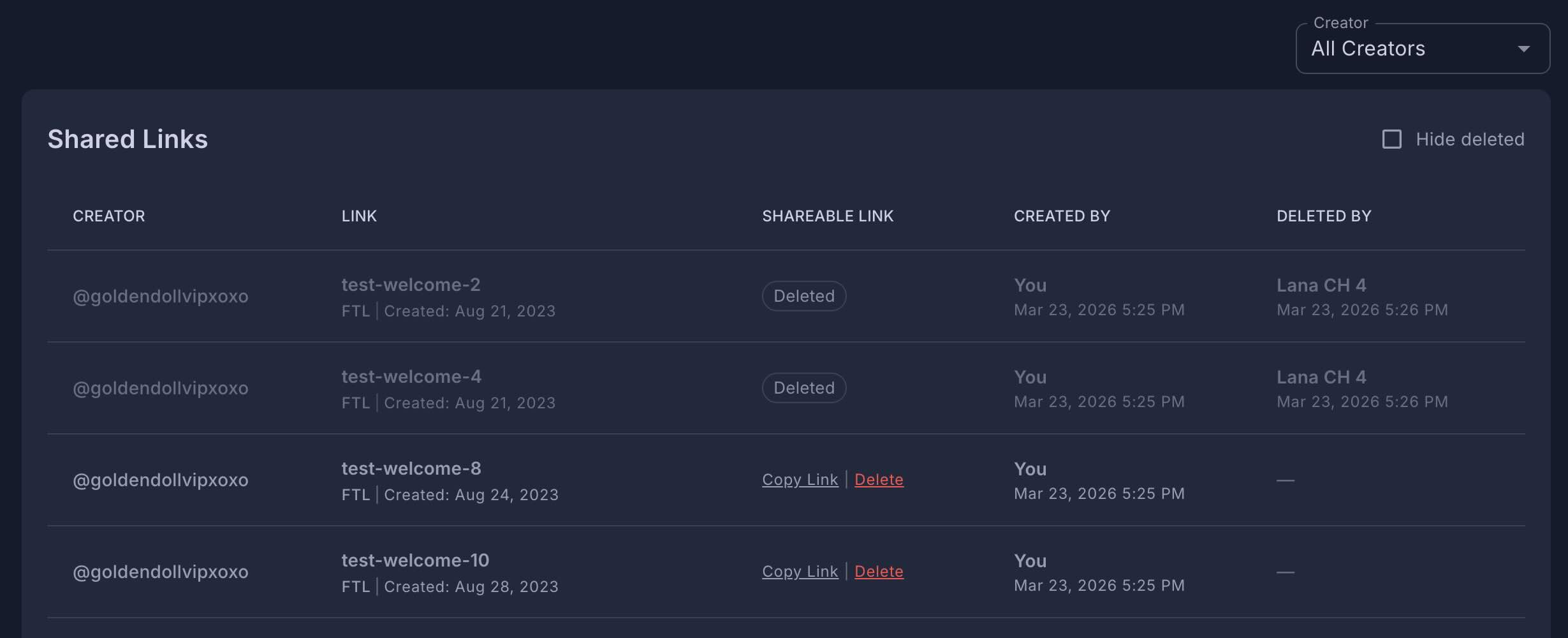 Puedes ver cada enlace compartible que se ha creado para todos tus creadores en un solo lugar: